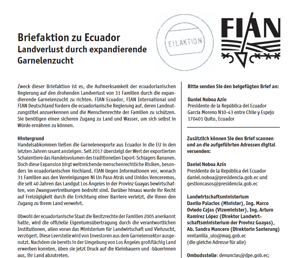 Zweck dieser Briefaktion ist es, die Aufmerksamkeit der ecuadorianischen Regierung auf den drohenden Landverlust von 31 Familien durch die expandierende Garnelenzucht zu richten. FIAN fordert die ecuadorianische Regierung auf, deren Landnutzungstitel anzuerkennen und die Menschenrechte der Familien zu schützen. Sie benötigen einen sicheren Zugang zu Land und Wasser, um sich selbst in Würde ernähren zu können.
