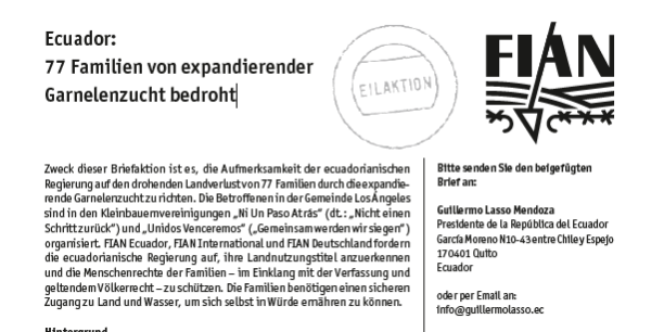 Zweck dieser Briefaktion ist es, die Aufmerksamkeit der ecuadorianischen Regierung auf den drohenden Landverlust von 77 Familien durch die expandierende Garnelenzucht zu richten. Die Betroffenen in der Gemeinde Los Ángeles sind in den Kleinbauernvereinigungen „Ni Un Paso Atrás“ (dt.: „Nicht einen Schritt zurück“) und „Unidos Venceremos“ („Gemeinsam werden wir siegen“) organisiert. FIAN Ecuador, FIAN International und FIAN Deutschland fordern die ecuadorianische Regierung auf, ihre Landnutzungstitel anzuerkennen und die Menschenrechte der Familien – im Einklang mit der Verfassung und geltendem Völkerrecht – zu schützen. Die Familien benötigen einen sicheren Zugang zu Land und Wasser, um sich selbst in Würde ernähren zu können.