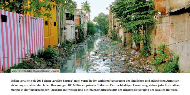 Indien versucht seit 2014 einen „großen Sprung“ nach vorne in der sanitären Versorgung der ländlichen und städtischen Armutsbevölkerung vor allem durch den Bau von gut 100 Millionen privater Toiletten. Der nachhaltigen Umsetzung stehen jedoch vor allem Mängel in der Versorgung der Haushalte mit Wasser und die fehlende Infrastruktur der sicheren Entsorgung der Fäkalien im Wege.