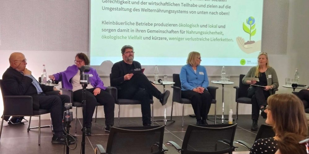 Saskia Richartz vom Ernährungsrat Berlin zeigte die Entwicklungen auf kommunaler Ebene auf: Es gibt bereits 60 Ernährungsräte in Deutschland, in denen sich engagierte Bürger*innen für eine gesunde, gerechte und nachhaltig produzierte regionale und ökologische Ernährung „vom Feld bis auf den Teller“ einsetzen. Auch FIAN-Vorstandsmitglied Judith Busch koordiniert einen Ernährungsrat (Oldenburg). Um in der Bundespolitik stärker wahrgenommen zu werden und mitreden zu können, haben die Ernährungsräte gerade eine Bundesnetzwerkstelle gegründet.
