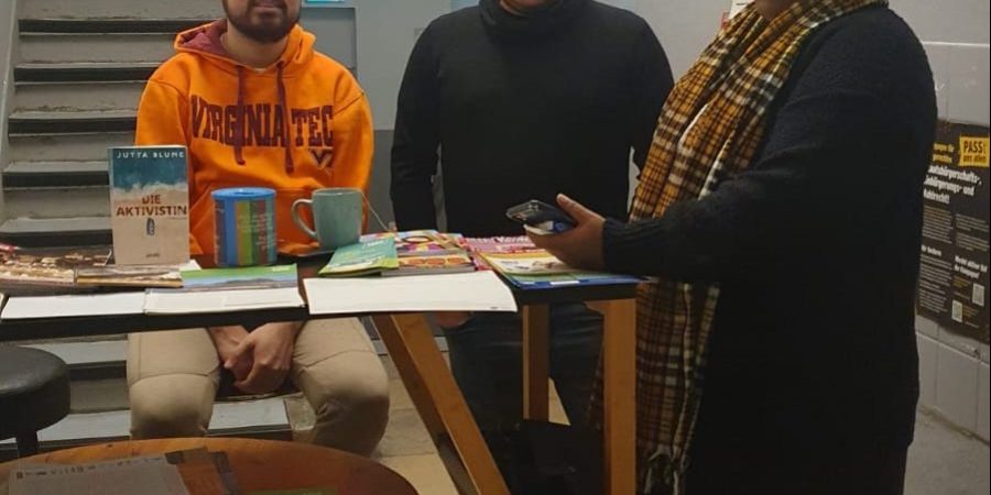 FIAN-Referent Marian Henn mit Venessa Cardenas Woods und Christopher Castillo in Köln