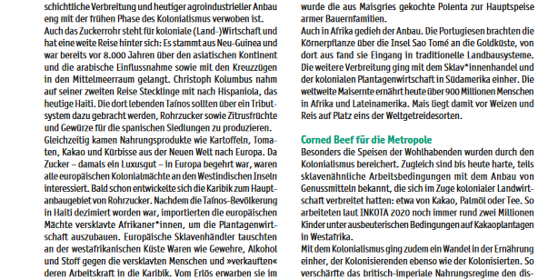 Der Handel mit Weizen, Reis und Gewürzen ist so alt wie die Migrationsgeschichte der Menschen. Der Kolonialismus hat das globale Ernährungssystem in seiner jetzigen Form stark geprägt. Auch die Hungerbekämpfung basiert oftmals noch auf kolonialem Gedankengut. Die Autorin des Artikels ist Martina Backes. Sie ist Biologin und Mitarbeiterin des iz3w.