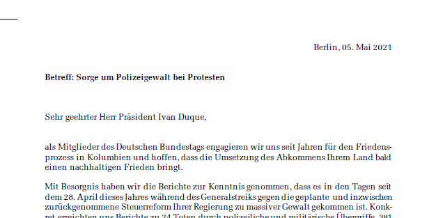 Über die Sorge um Polizeigewalt hat eine Parteiübergreifende Gruppe von 15 Bundestagsabgeordneten einen Brief an Kolumbiens Präsidenten Ivan Duque geschrieben.