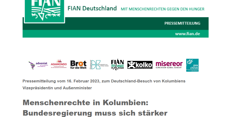 Die Presseerklärung tragen: Lateinamerika-Hilfswerk Adveniat, Agiamondo, Brot für die Welt, Diözesanrat Aachen, FIAN Deutschland, kolko – Menschenrechte für Kolumbien e. V., Bischöfliches Hilfswerk Misereor, pax christi – Deutsche Sektion.