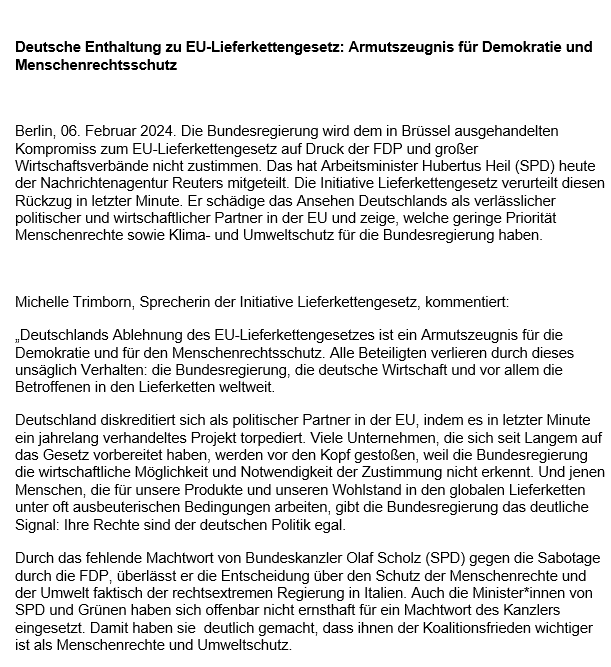 MEHR ERFAHRENBerlin, 06. Februar 2024. Die Bundesregierung wird dem in Brüssel ausgehandelten Kompromiss zum EU-Lieferkettengesetz auf Druck der FDP und großer…