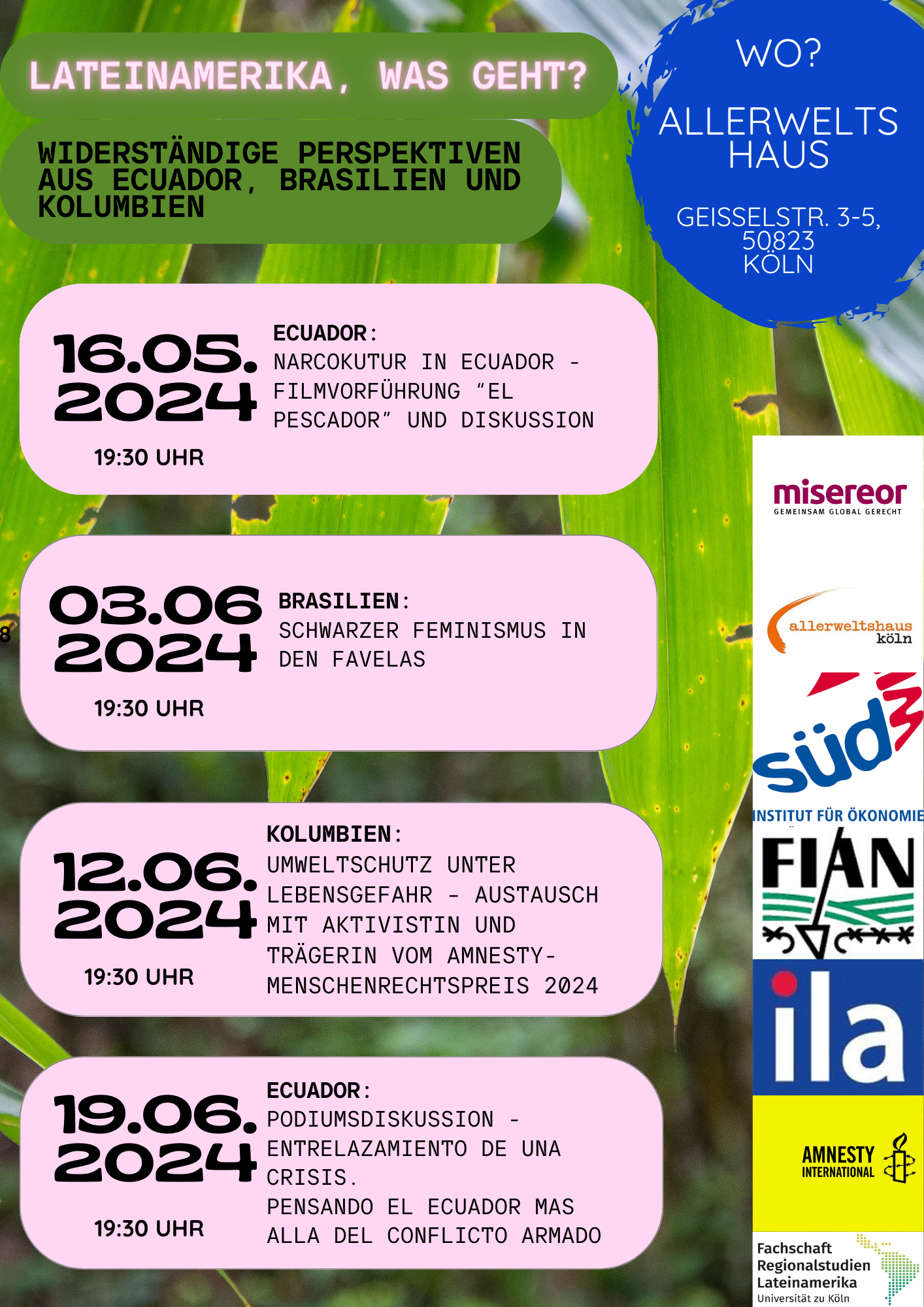 MEHR ERFAHRENIn unsere Veranstaltungsreihe „Lateinamerika, was geht?“ möchten wir an vier Terminen verschiedene widerständige Bewegungen, Personen und Perspektiven aus Lateinamerika kennen…