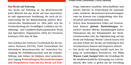 Dies nehmen die Deutsche Gesellschaft für die Vereinten Nationen (DGVN), FIAN Deutschland, der Arbeitskreis Menschenrechte der Deutschen Vereinigung für Politikwissenschaft und die Schader-Stiftung zum Anlass im Rahmen einer gemeinsamen Tagung Entwicklungen, Herausforderungen und Perspektiven rund um das Recht auf Nahrung zu diskutieren.