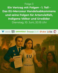 Ab dem 27. Mai immer dienstags, 20.15-21.00 auf Zoom tauchen wir in die Untiefen des kontroversen EU-Mercosur Handelsabkommens ab. Die Serie richtet sich dabei besonders an Menschen, die besser verstehen möchten, worum es bei dem Abkommen geht und dazu auch aktiv werden wollen.