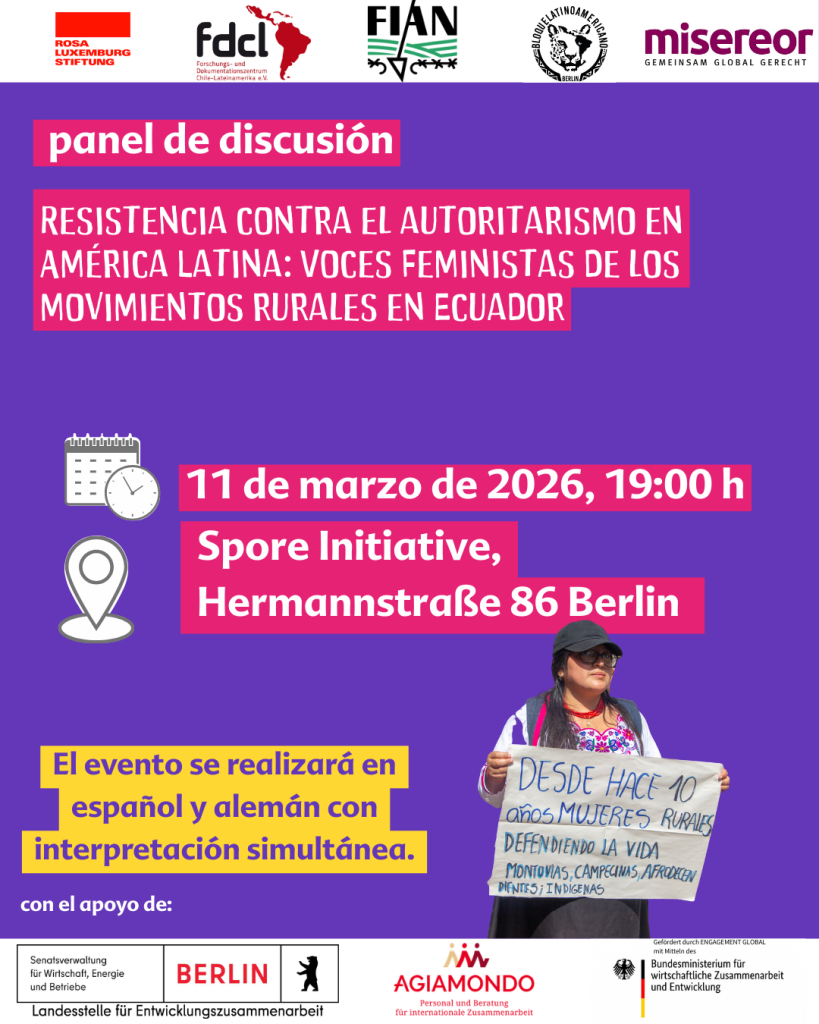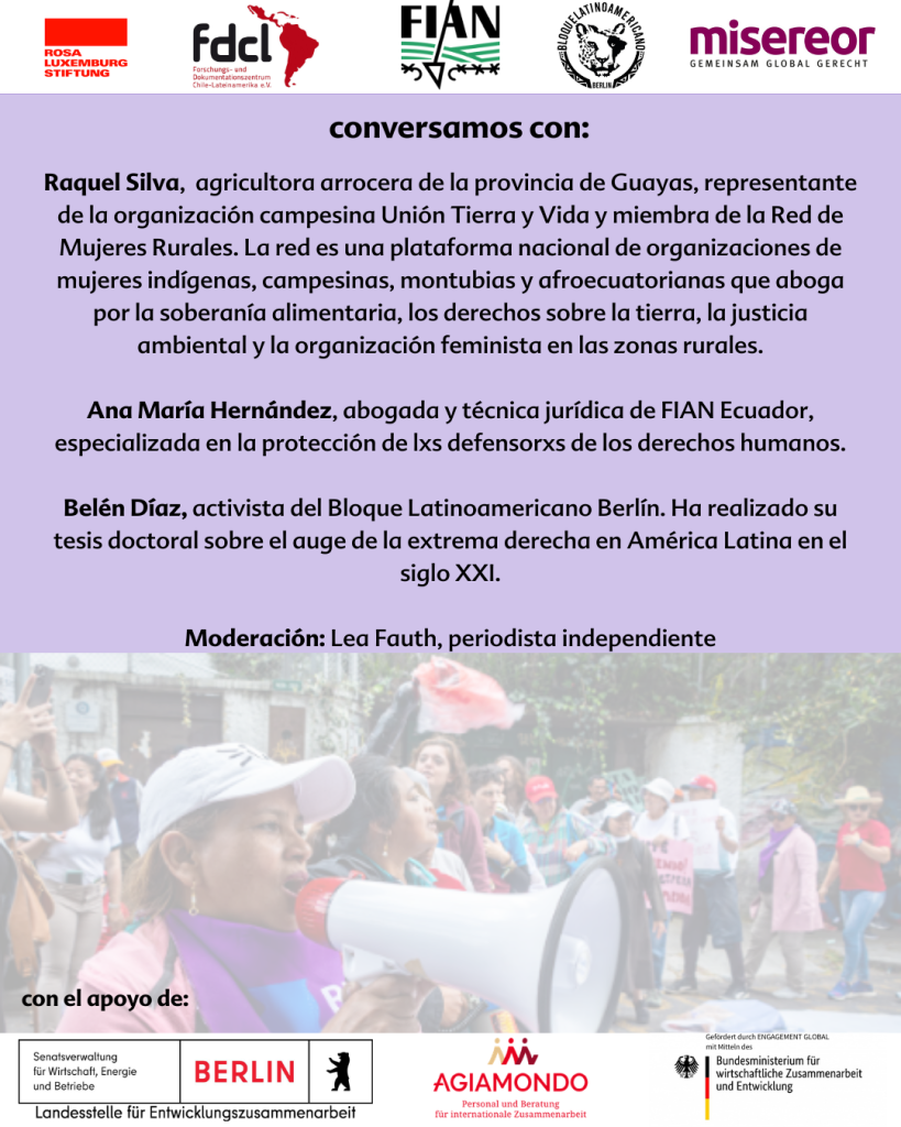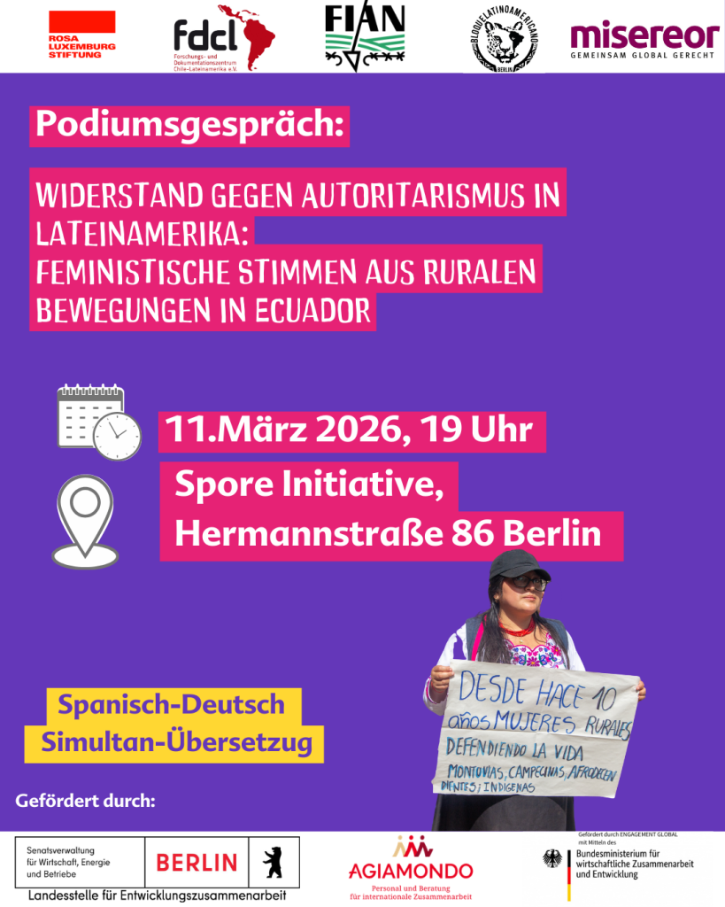 Die Veranstaltung findet im Rahmen einer gemeinsamen Rundreise von FIAN Ecuador und dem ecuadorianischen Netzwerk Ländlicher Frauen (Red de Mujeres Rurales) vom 2. bis 18. März 2026 statt. In Genf, Köln, Berlin und Brüssel bringen sie bäuerliche und feministische Perspektiven auf die aktuelle Situation in Ecuador in internationale Gremien, politische Debatten und zivilgesellschaftliche Räume ein.