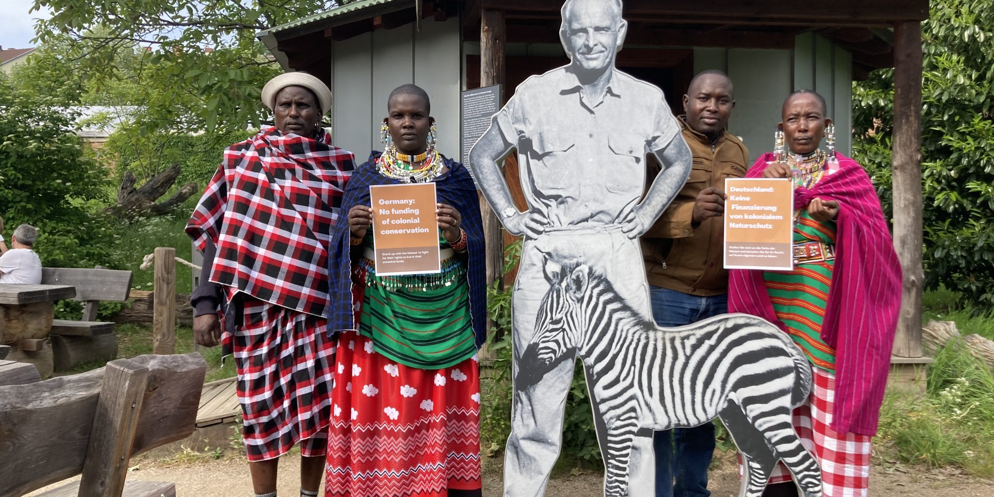 Maasai fordern „Keine Finanzierung von kolonialem Naturschutz“ neben einem Bild von Bernhard Grimzek im Frankfurter Zoo
