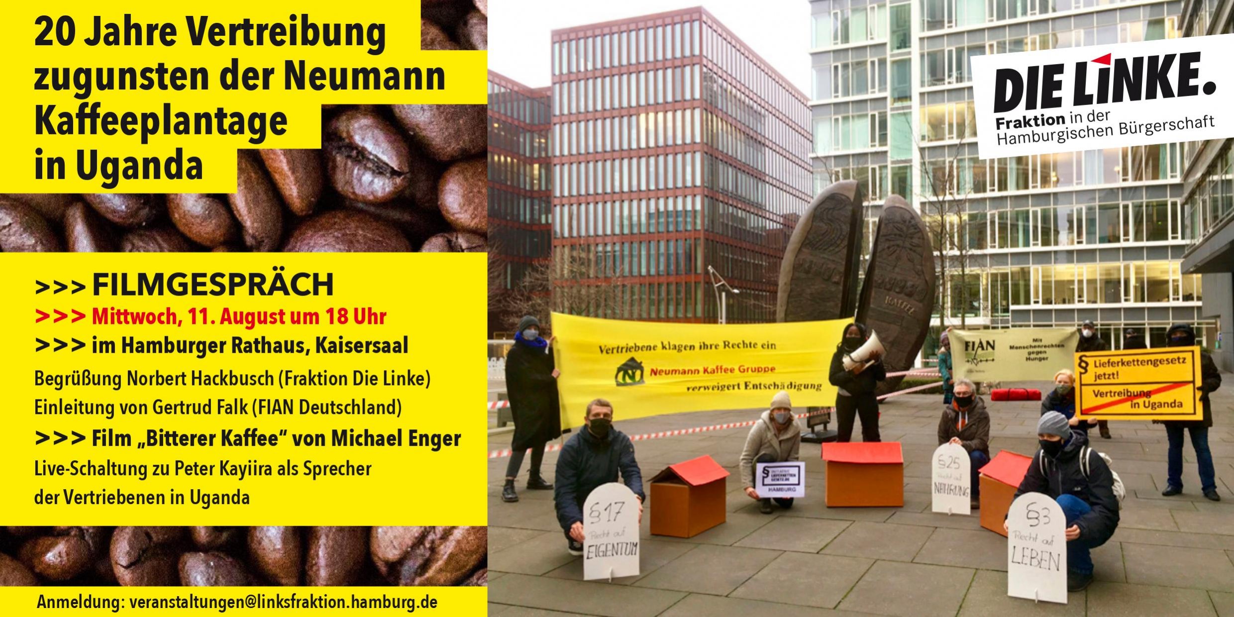 Im August 2001 hat die ugandische Armee vier Dörfer zerstört und ihre Bewohner*innen vertrieben, damit die Neumann Kaffee Gruppe auf diesem Land die Kaweri Coffee Plantation anlegen kann. Die Vertriebenen kämpfen bis heute mit friedlichen Mitteln um Wiedergutmachung. Die Neumann Kaffee Gruppe hat bisher keine Entschädigung angeboten.